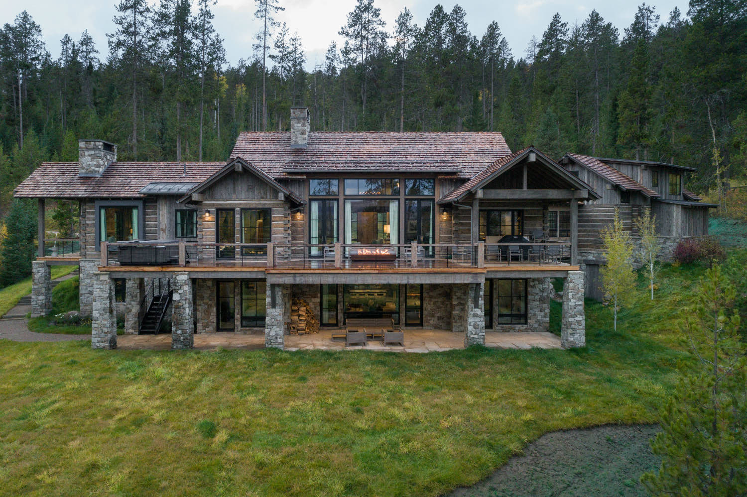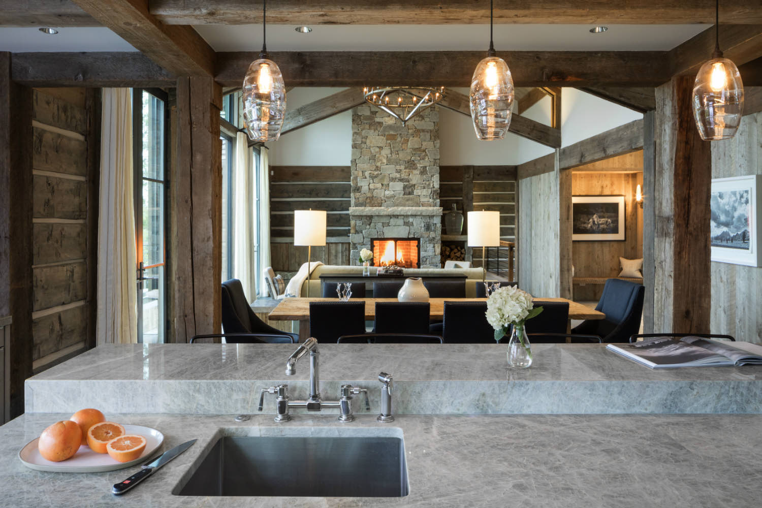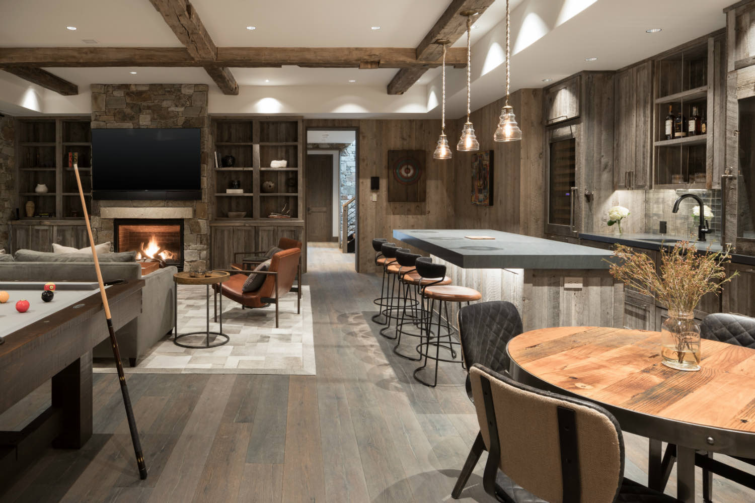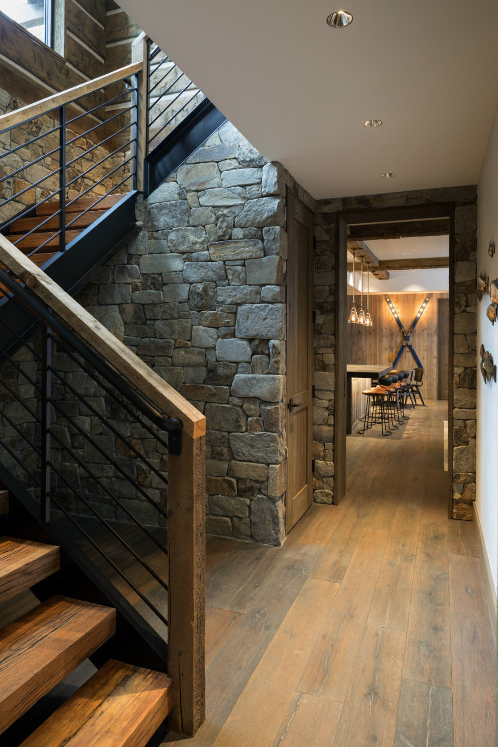 Stone elements ground the building both literally and visually. We used local stone for fireplace masses and foundation work where the building meets the ground. The weight and texture of stone balance the linear quality of the timber framing.