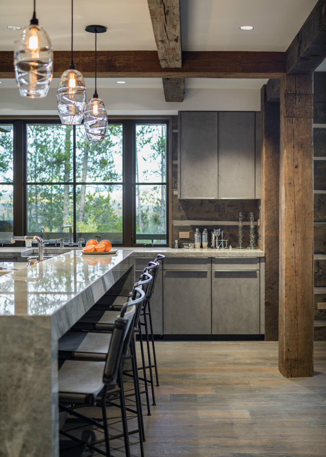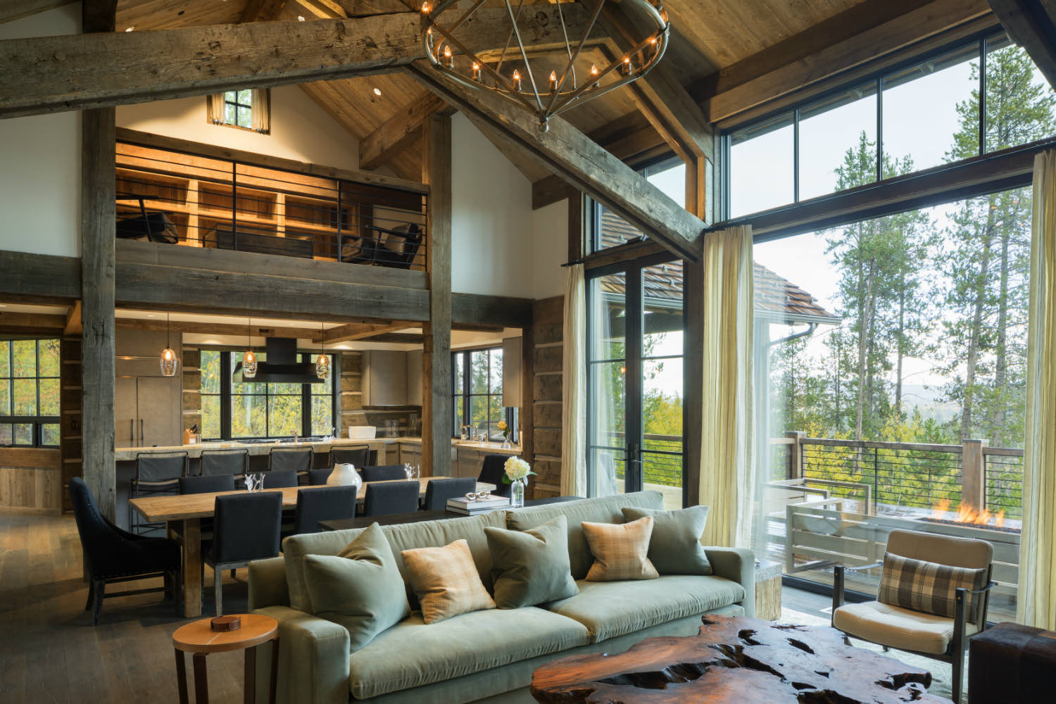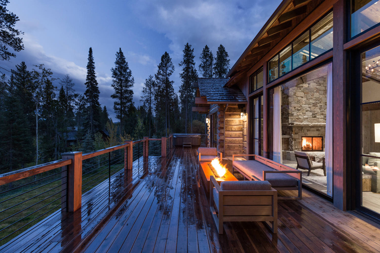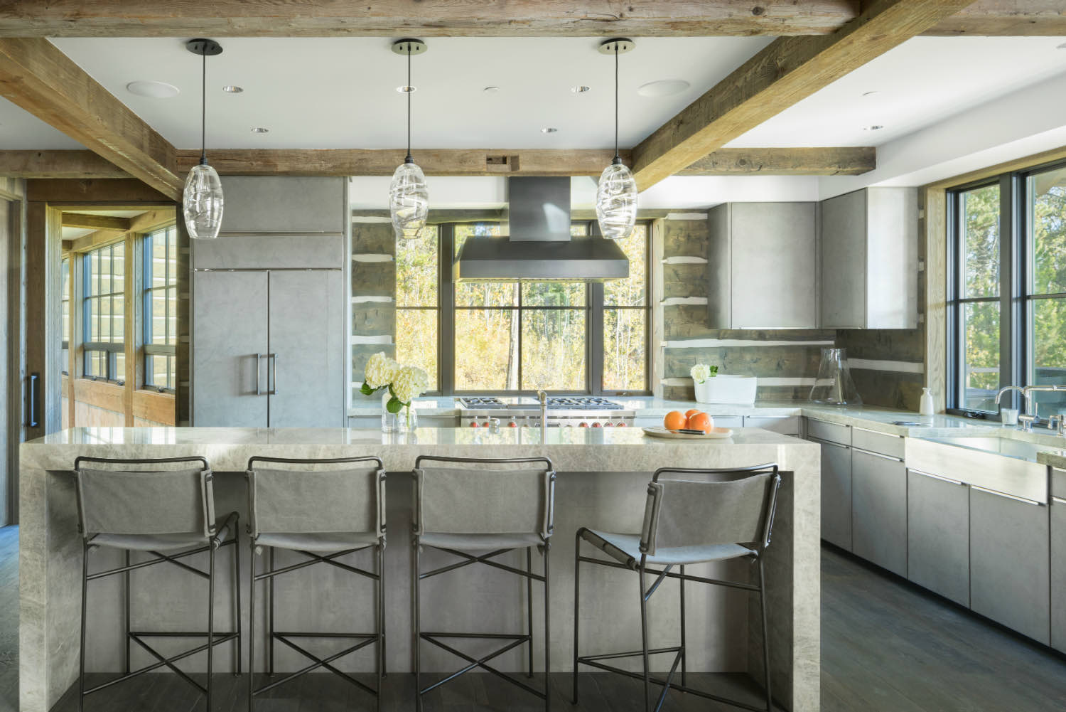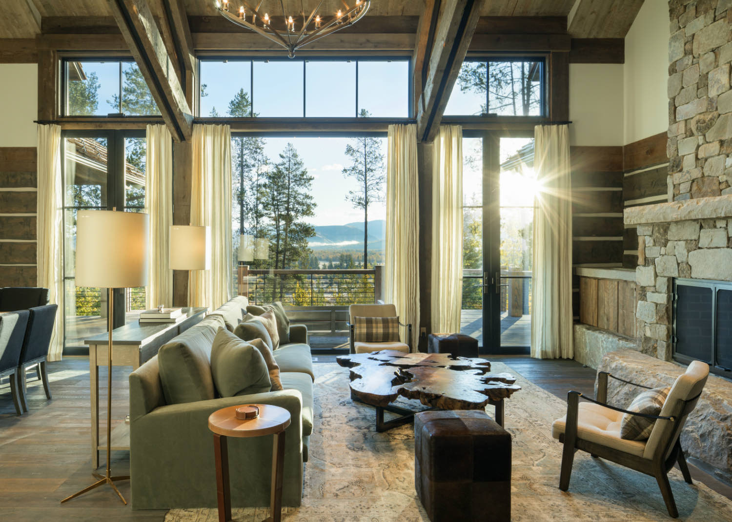 Stone elements ground the building both literally and visually. We used local stone for fireplace masses and foundation work where the building meets the ground. The weight and texture of stone balance the linear quality of the timber framing.