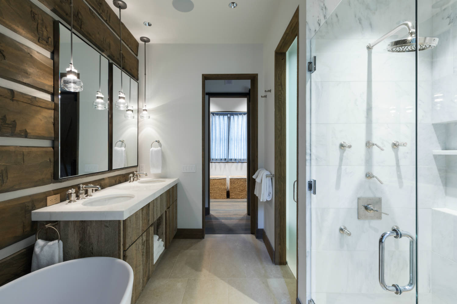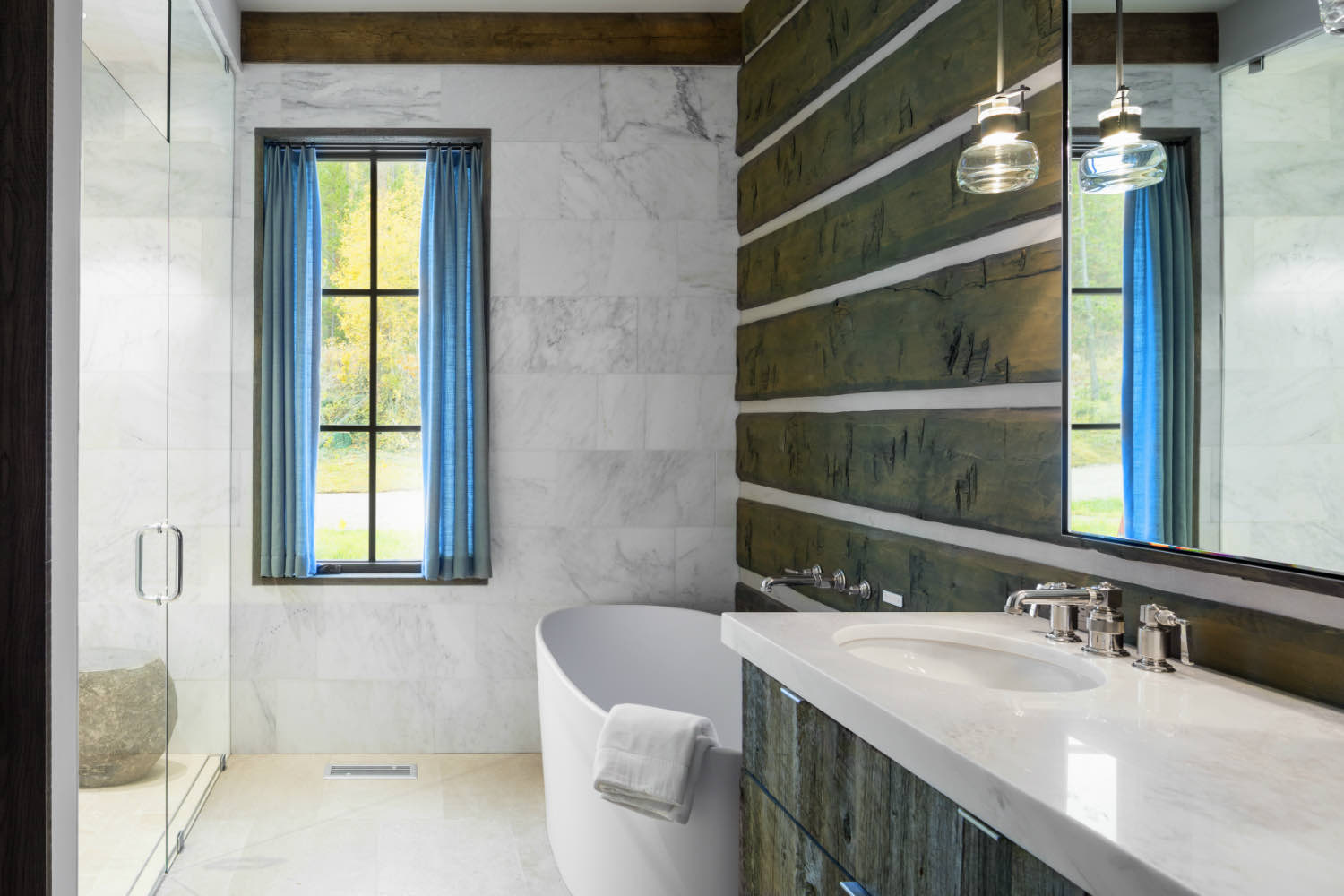 The bathrooms pair natural materials with functional fixtures. Stone, tile, and wood work together without competing. We kept these spaces straightforward, letting material quality and careful detailing do the work rather than elaborate finishes.