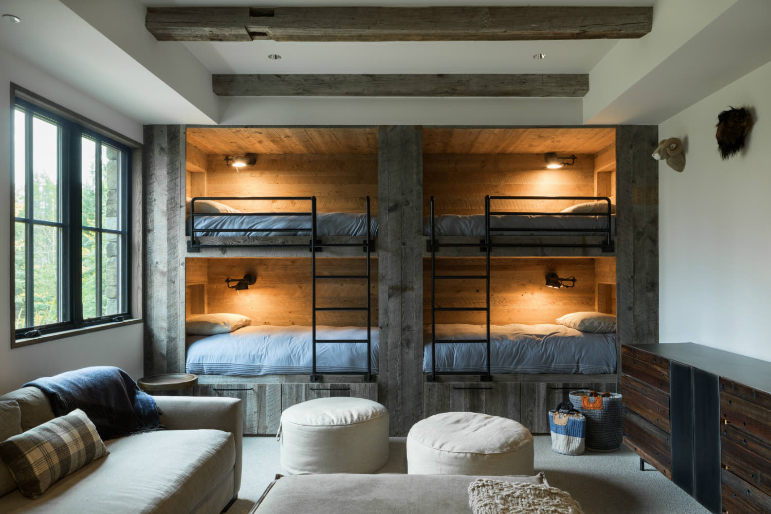 Natural light moves through the spaces differently throughout the day. We positioned windows and skylights to bring in high light without compromising wall space needed for furniture and storage. The interplay between direct and indirect light creates depth in rooms that might otherwise feel contained.