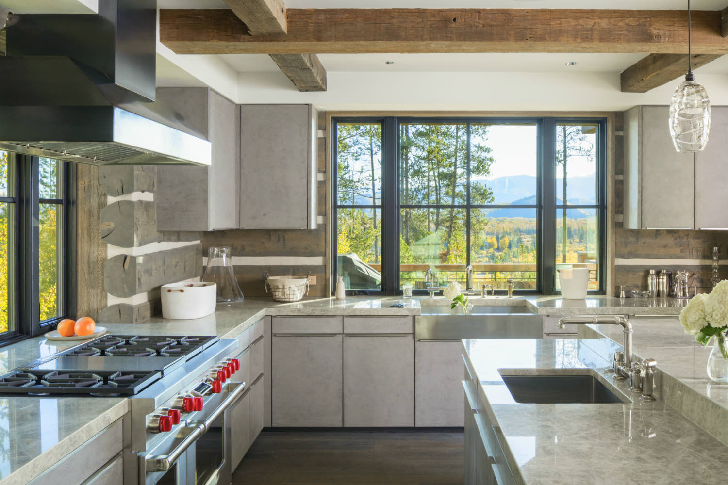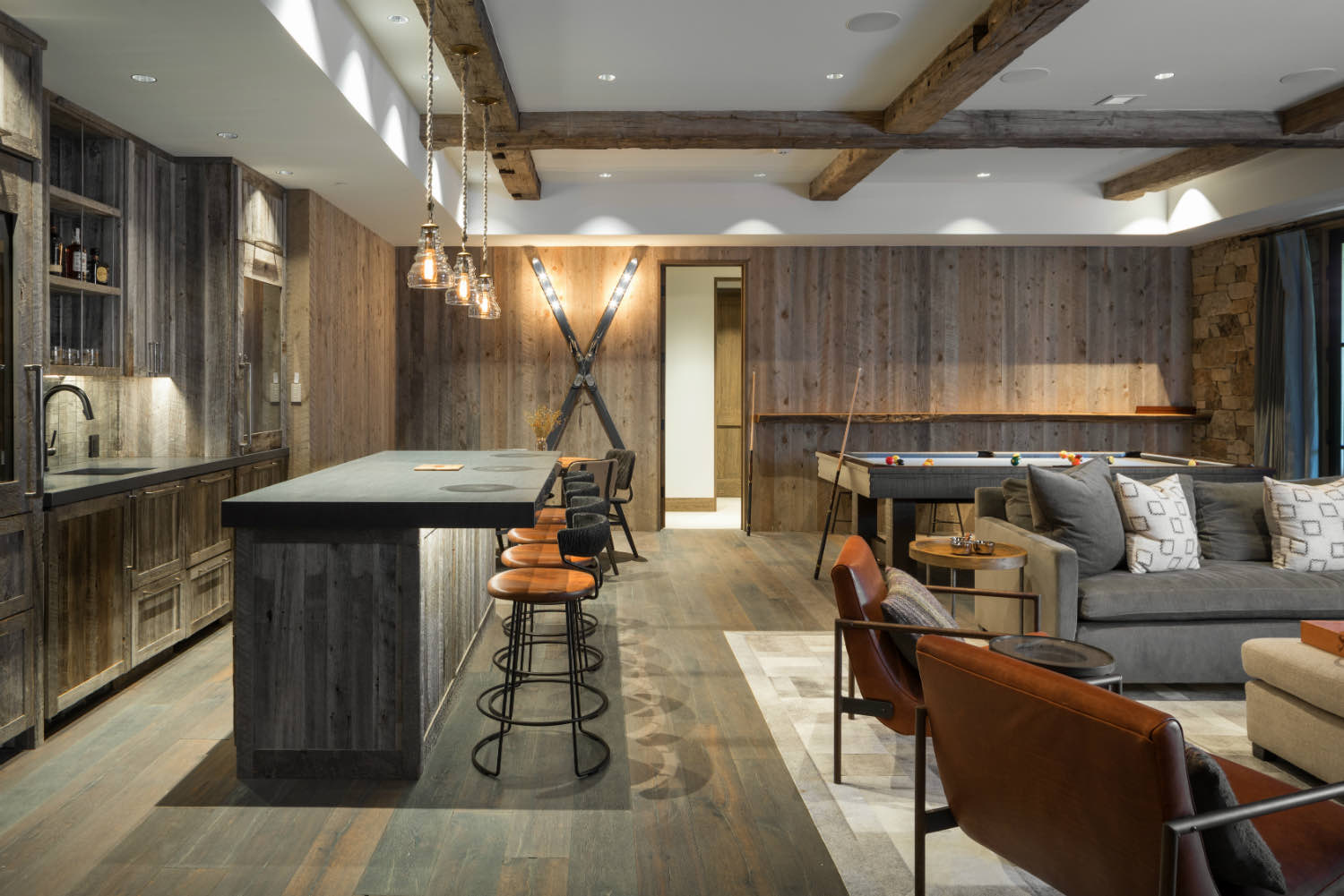 In the kitchen, we used built-in cabinetry and open shelving to maximize usable space. In a cabin, every piece of millwork needs to work harder. Storage, display, and workspace functions often combine in single elements. The timber structure overhead continues through these service areas, maintaining the architectural language.