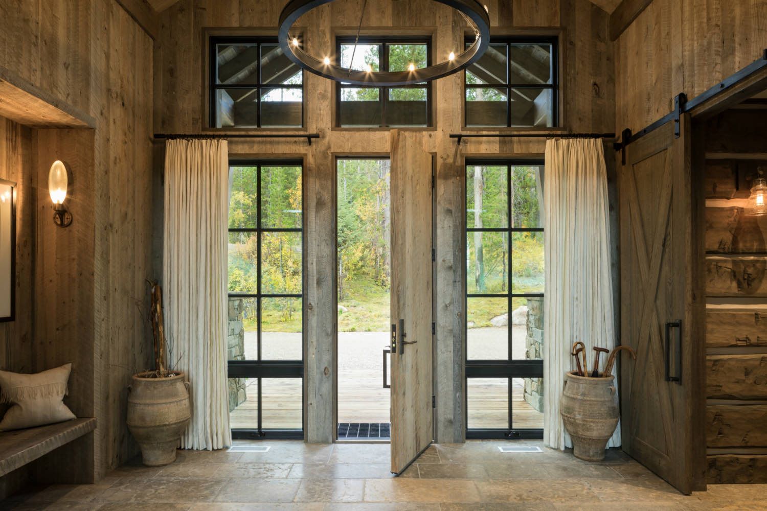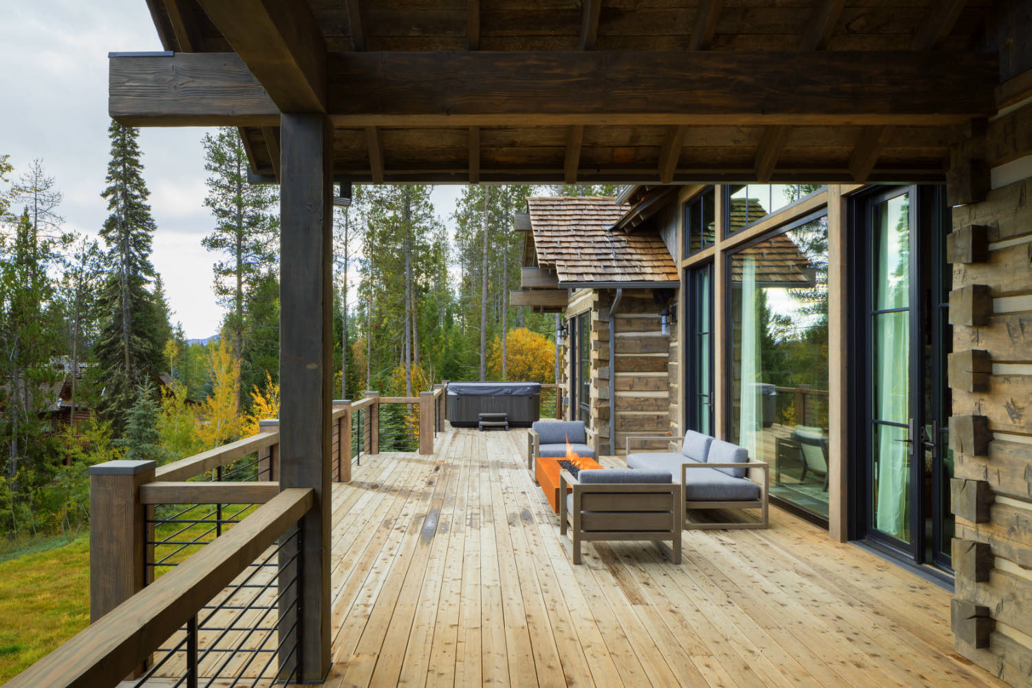 Outdoor spaces extend the program. Stone patios, wood decks, and covered porches create rooms outside that are as carefully designed as the interior spaces. These areas get used from spring through fall, and serve as covered outdoor storage and transition zones during winter months.