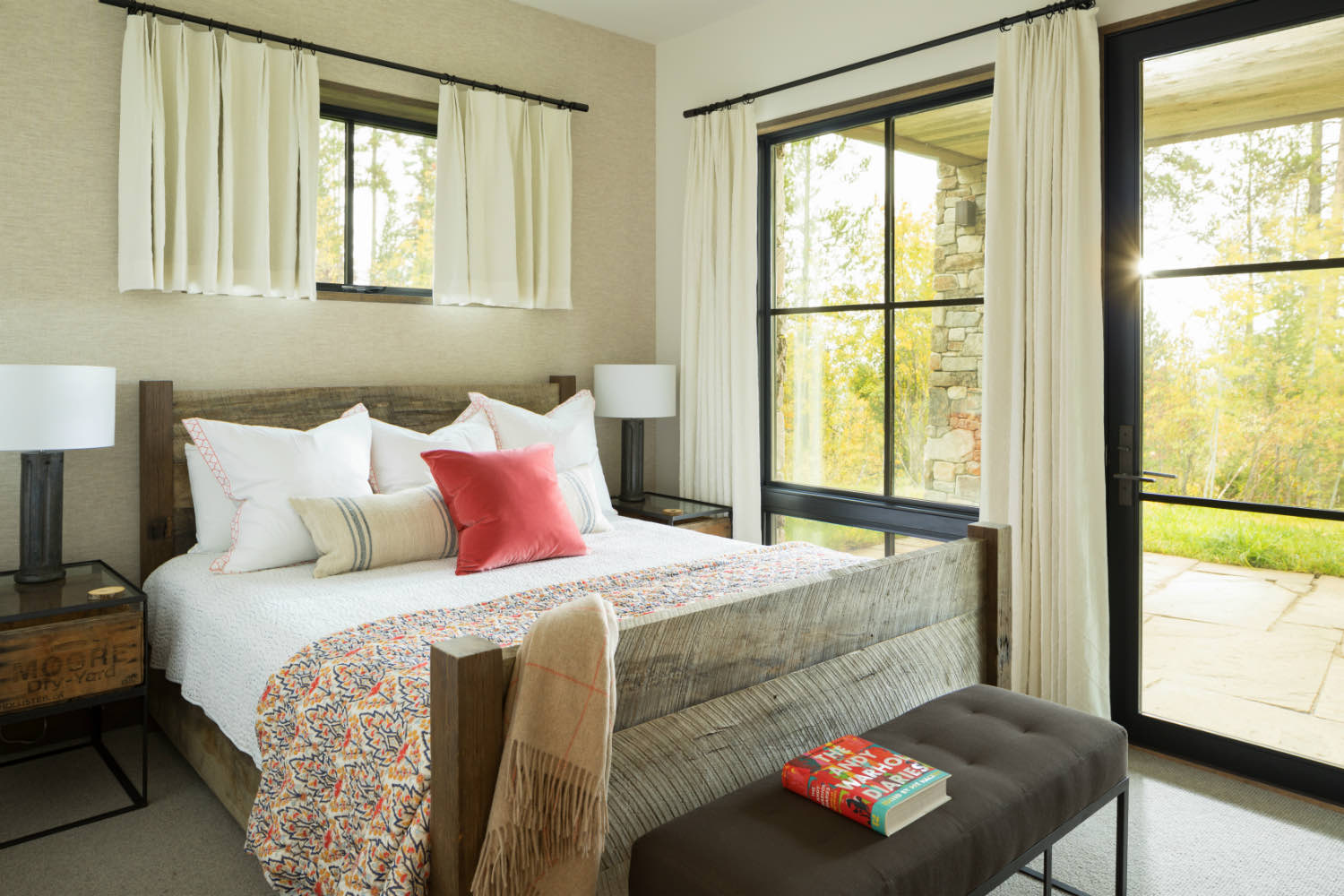 Bedrooms occupy quieter parts of the plan, away from the main living areas. We maintained the exposed timber ceiling structure throughout, but used lower ceiling heights in the sleeping spaces. This creates a more intimate scale appropriate for these rooms.